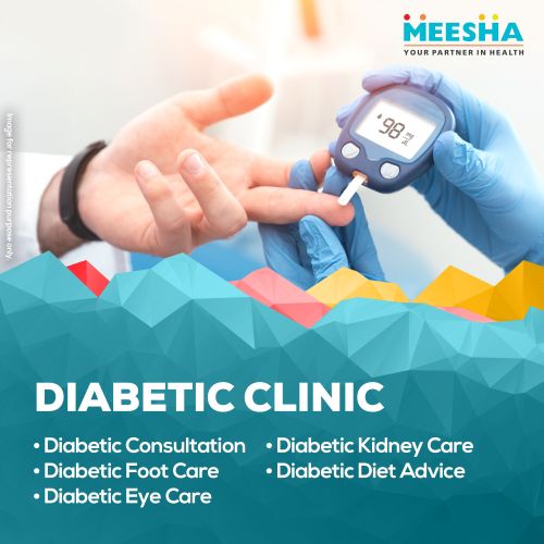 The Diabetes Clinic at Meesha Healthcare offers diagnosis, blood sugar monitoring, insulin therapy, lifestyle counseling, and complications screening.